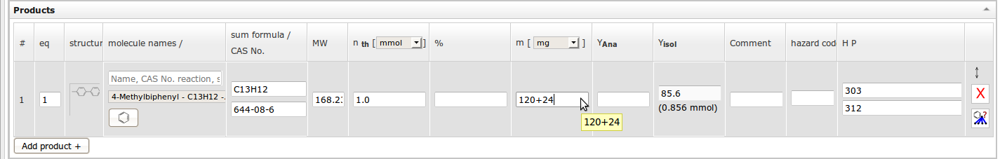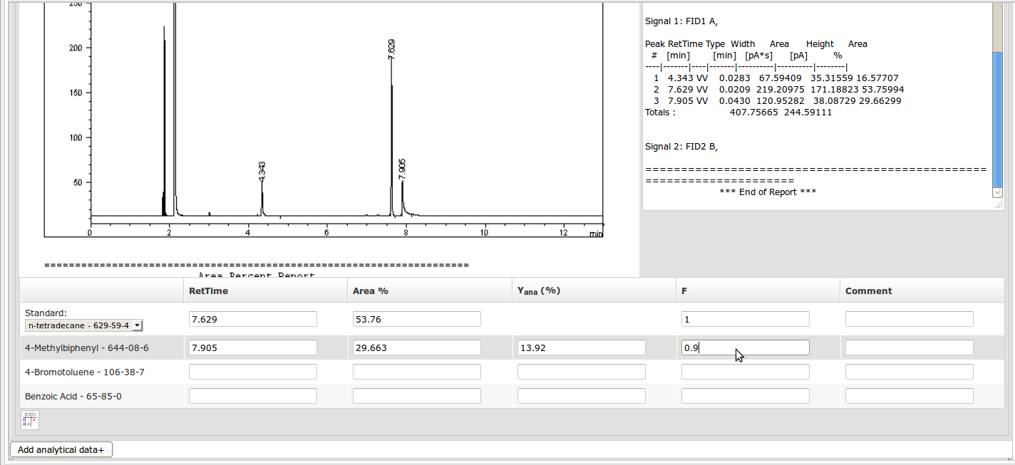Schließlich hilft Sciformation ELN bei der Berechnung der Reaktionsausbeute: entweder indem die isolierte Produktmenge (ggf. mit Reinheit) angegeben wird (isolierte Ausbeute) oder durch halbautomatische Auswertung von Chromatogrammen mit internem Standard.