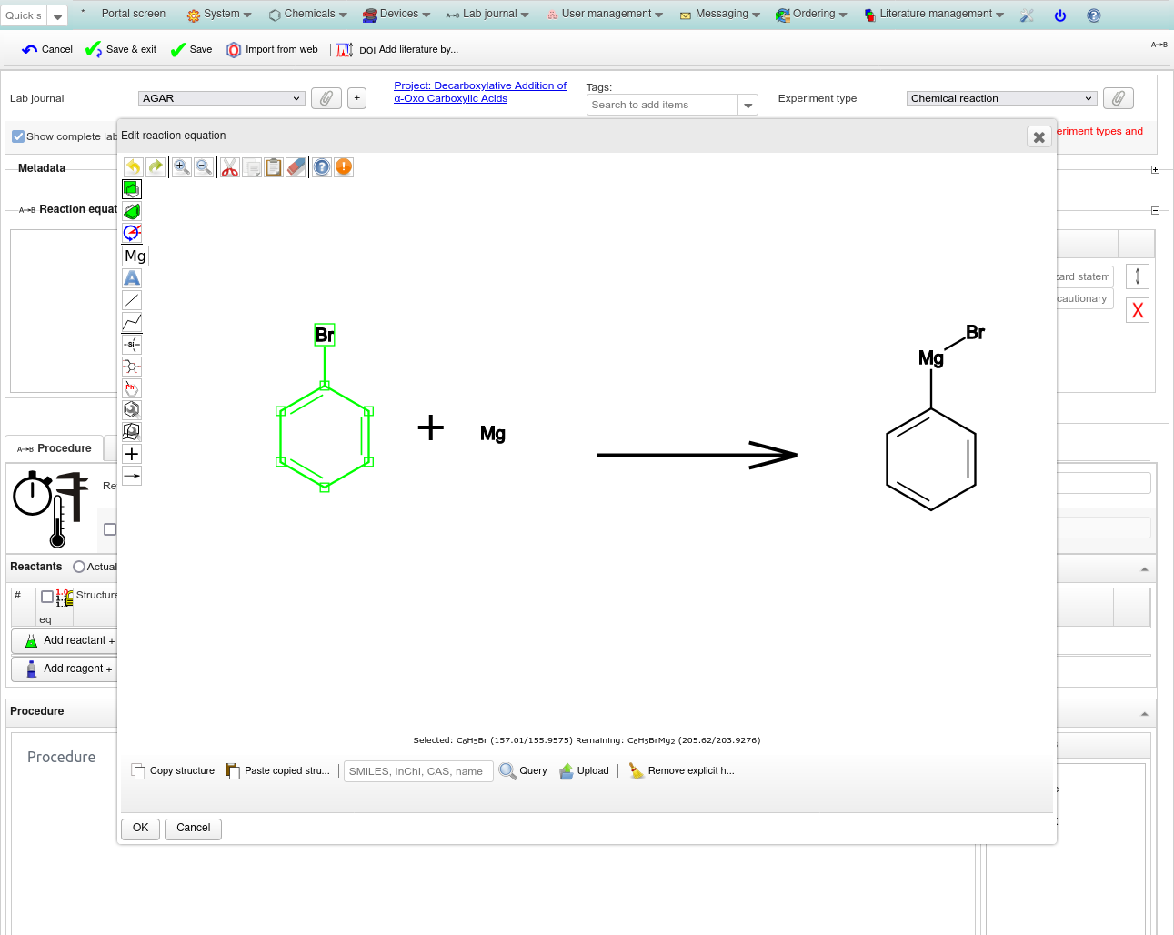 Der Startpunkt chemischer Experimente ist die Reaktionsgleichung. In Sciformation ELN kann diese entweder