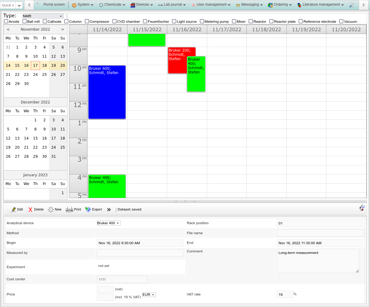 | Die naturwissenschaftliche Arbeit baut in hohem Maße auf die Verfügbarkeit gut gewarteter Geräte auf. Diese stellen oft eine knappe Ressource dar, und es ist praktisch, wenn man über ein Buchungssystem direkt prüfen kann, ob das Gerät verfügbar ist - und direkt Messzeiten buchen oder auf eine geeignete Alternative ausweichen kann. Die Buchung kann auch auf Nutzer eingeschränkt werden, für die eine notwendige Sicherheitsunterweisung im System hinterlegt ist. Für spätere Abrechnungszwecke kann eine Kostenstelle erfasst werden, um die Gerätenutzung zusammen mit Bestellungen einheitlich abzurechnen. | |