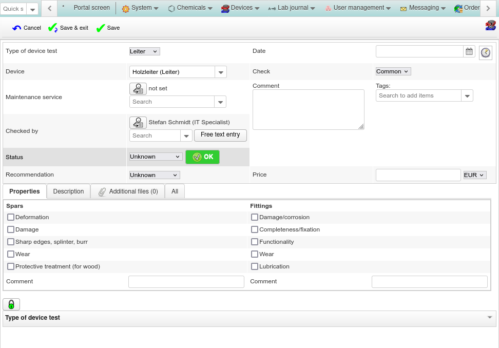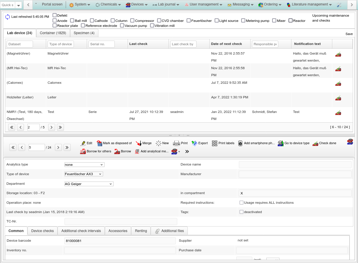 Für den sicheren Betrieb und die zuverlässige Funktion der Geräte sind regelmäßige Wartungen und Prüfungen unabdingbar. Deshalb können in Sciformation ELN für Gerätetypen oder Einzelgeräte Wartungsintervalle definiert werden, über die ein Wartungs-Cockpit benachrichtigt. Für ein Gerät oder Modell können auch mehrere Intervalle festgelegt werden, z.B.