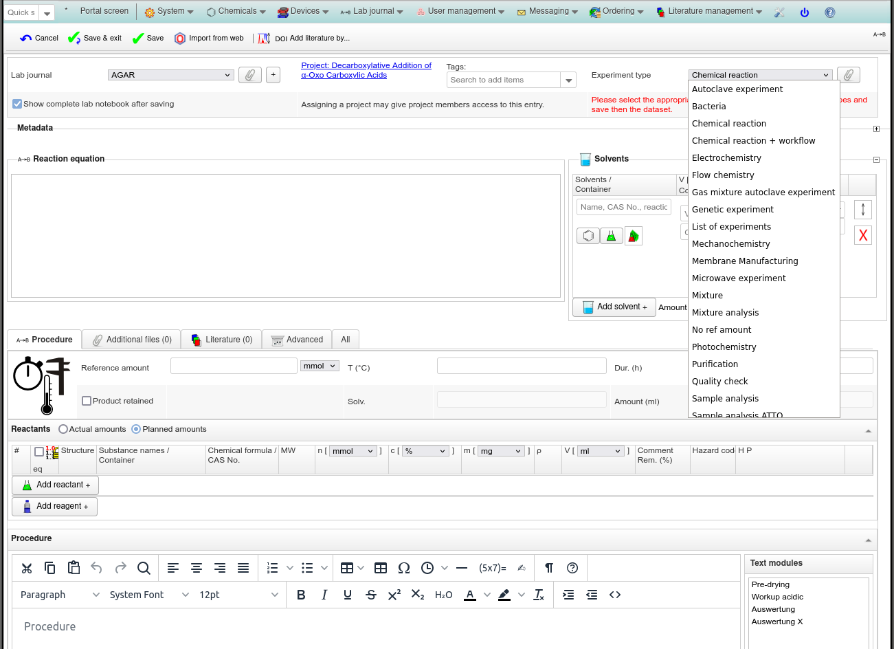 | Das Laborjournal dient der Versuchsplanung, der Beschreibung des Versuchsverlaufs und der Erfassung aller Beobachtungen, speziell analytischer Messdaten. Sciformation ELN integriert all diese Daten auf einer Plattform. | ||||||||
